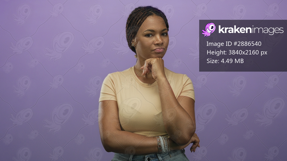 Woman with hand on chin and folded arms standing in studio beside purple wall wearing beige tee and denim jeans; contemplative thought.
