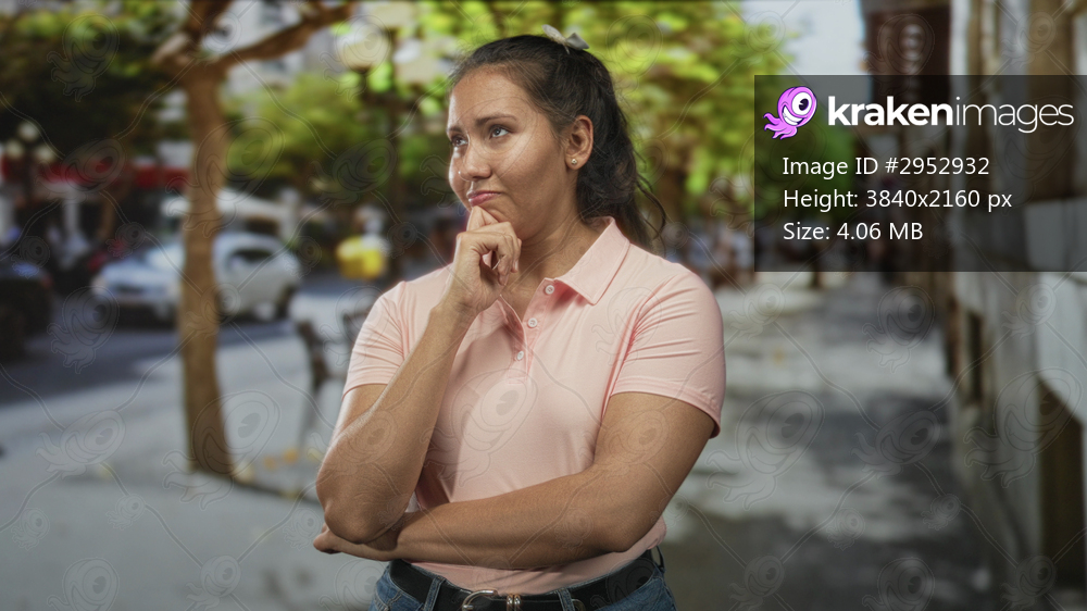 Woman with hand on chin and folded arms standing on a city street with trees and parked cars; contemplation.