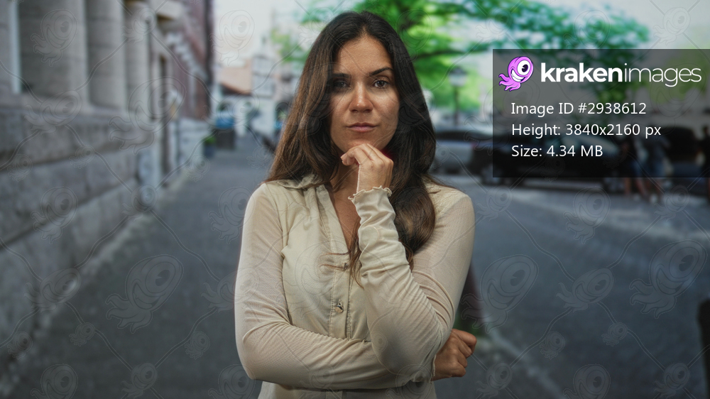 Woman with hand on chin and folded arms standing on a cobblestone street with parked cars and trees; confidence pondering reflection.