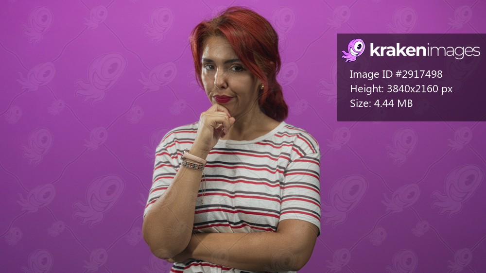 Woman with hand on chin for thinking in purple studio wearing striped shirt and bracelet, arms crossed; quiet contemplation.