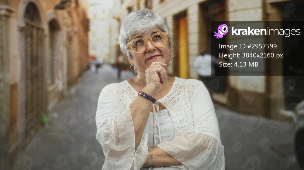 Woman with hand on chin and glasses, wearing a white blouse and beaded bracelet in a narrow cobblestone street; quiet contemplation.