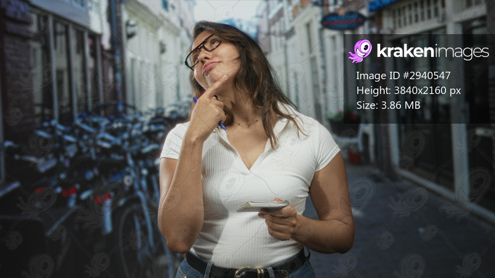 Woman with hand on chin holding notepad and pen on narrow city street lined with bicycles and buildings; contemplation planning.