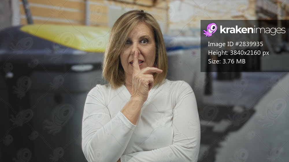 Woman with hand on chin in a shaded downtown street beside a recycling container; quiet reflection.