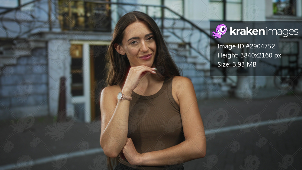 Woman with hand on chin in brown tank top standing on street by building staircase, watch on wrist; quiet confidence.