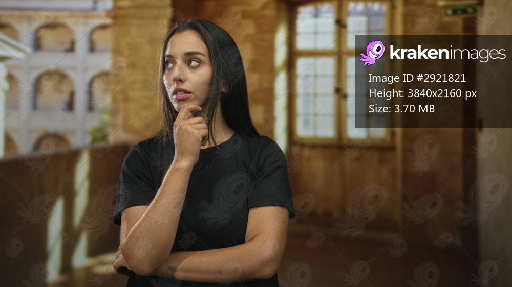 Woman with hand on chin in building hallway by arched windows, arms folded and gaze turned upward in old town setting; thoughtful.