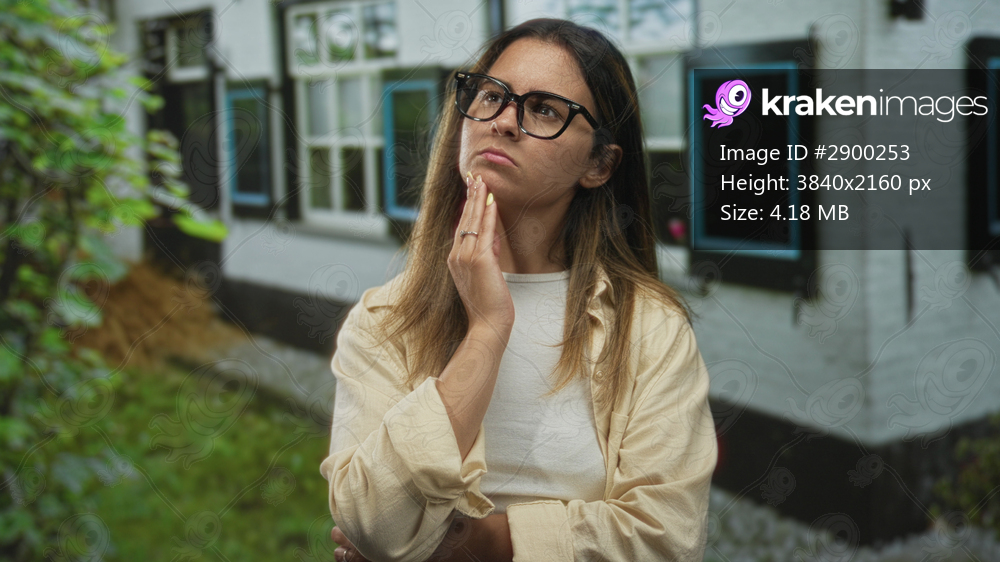 Woman with hand on chin in front of house entrance touching jaw in a pensive pose; thoughtful reflection.