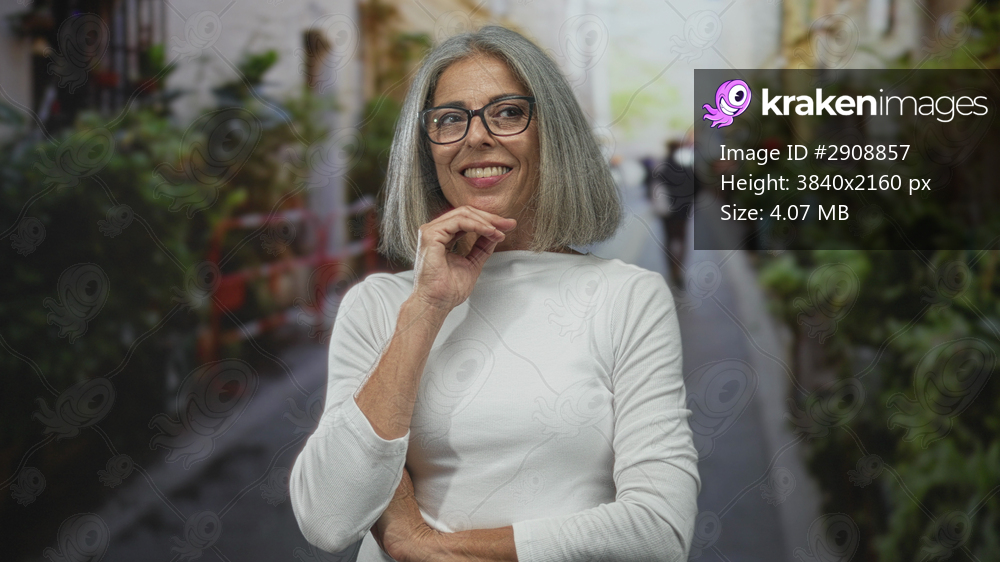 Woman hand on chin in narrow street wearing glasses, grey hair visible; contemplation wisdom curiosity.