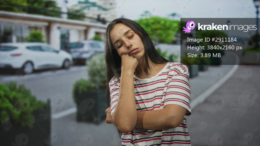 Woman with hand on chin in striped shirt on street near parked cars and planter boxes, leaning with closed eyes; pensive contemplation solitude.