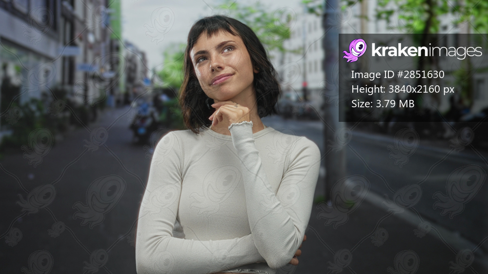 Woman with hand on chin on a bustling urban street with blurred building facades in daylight; contemplation.