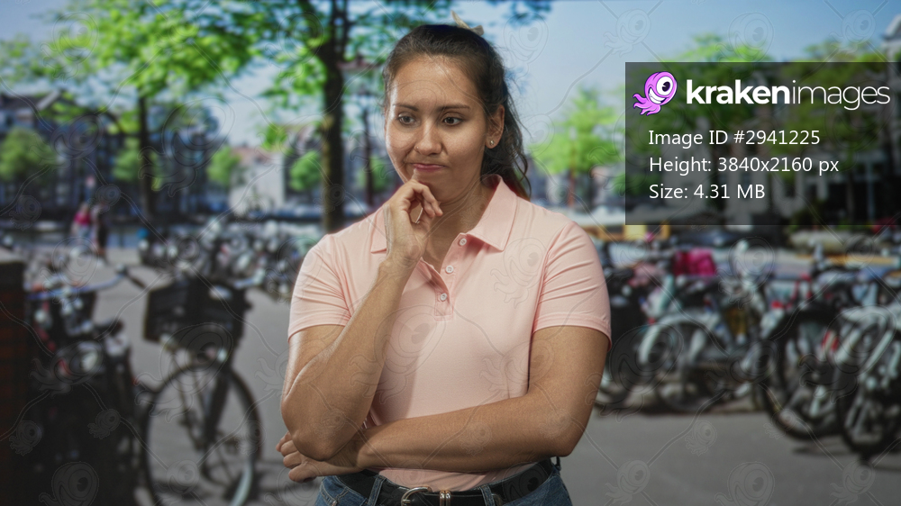Woman hand on chin on amsterdam street wearing pink polo and jeans, casual stance; thoughtful reflection.