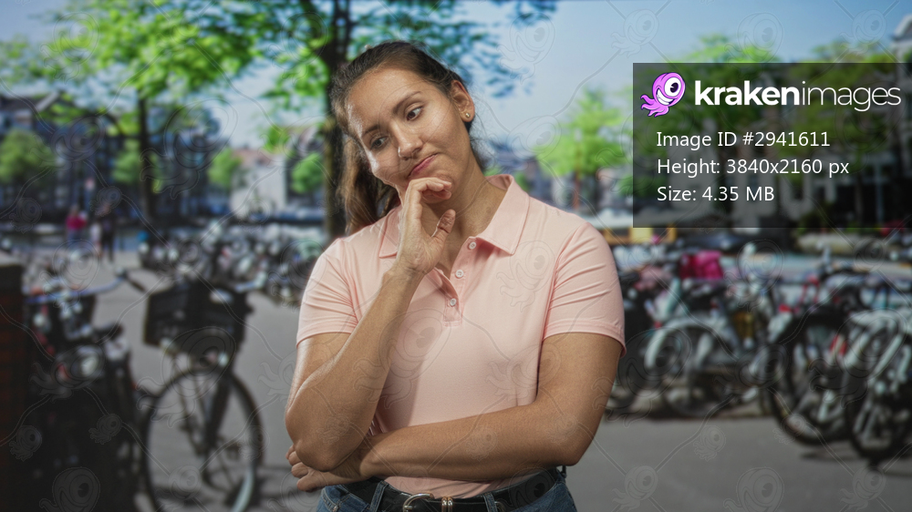 Woman hand on chin on amsterdam street wearing pink polo and jeans, casual stance; thoughtful reflection.
