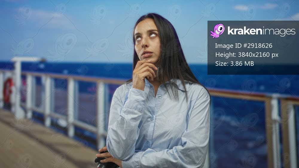 Woman with hand on chin on cruise deck, gaze upward, face and shirt visible; contemplation solitude.
