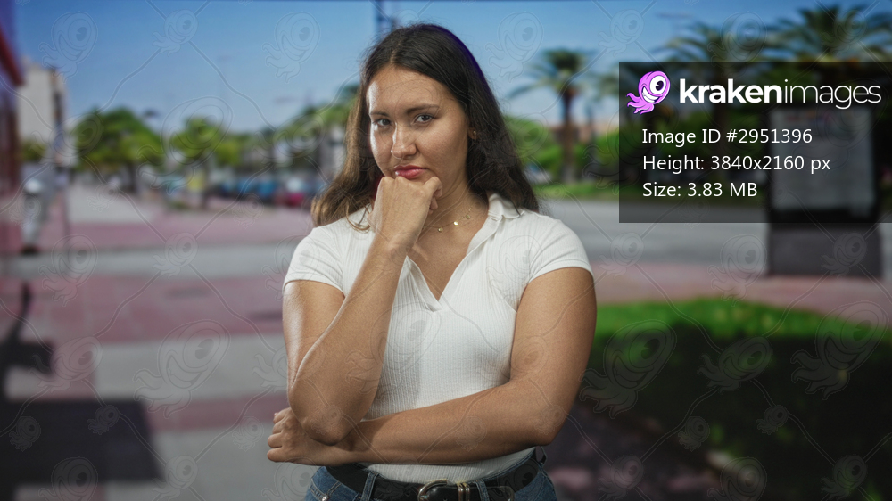 Woman with hand on chin on street beside palm trees and sidewalk in daytime urban scene; thoughtful contemplation pondering.