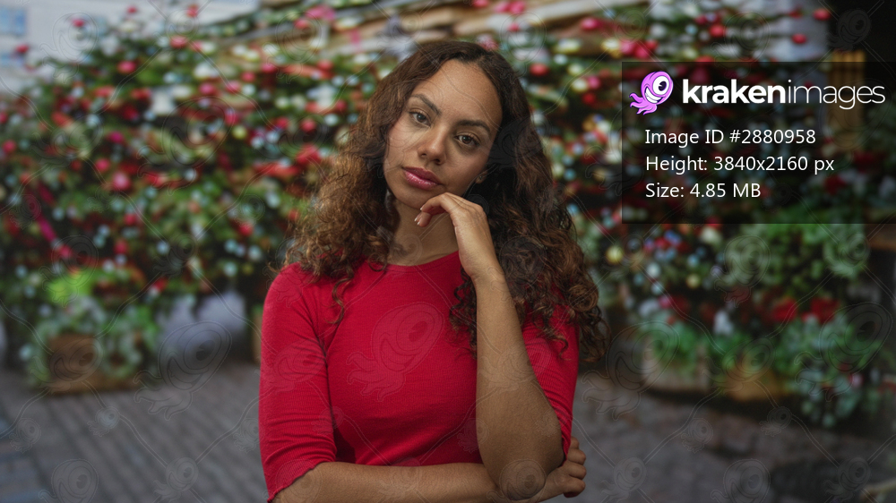 Woman hand on chin on street near decorated market stall with ornaments and planters; quiet thoughtful solitude.