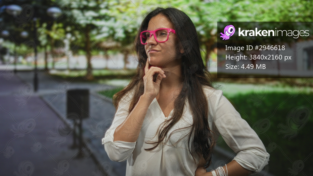 Woman with hand on chin on street near trees and lampposts wearing pink glasses and white blouse, considering her options; thoughtful reflection.