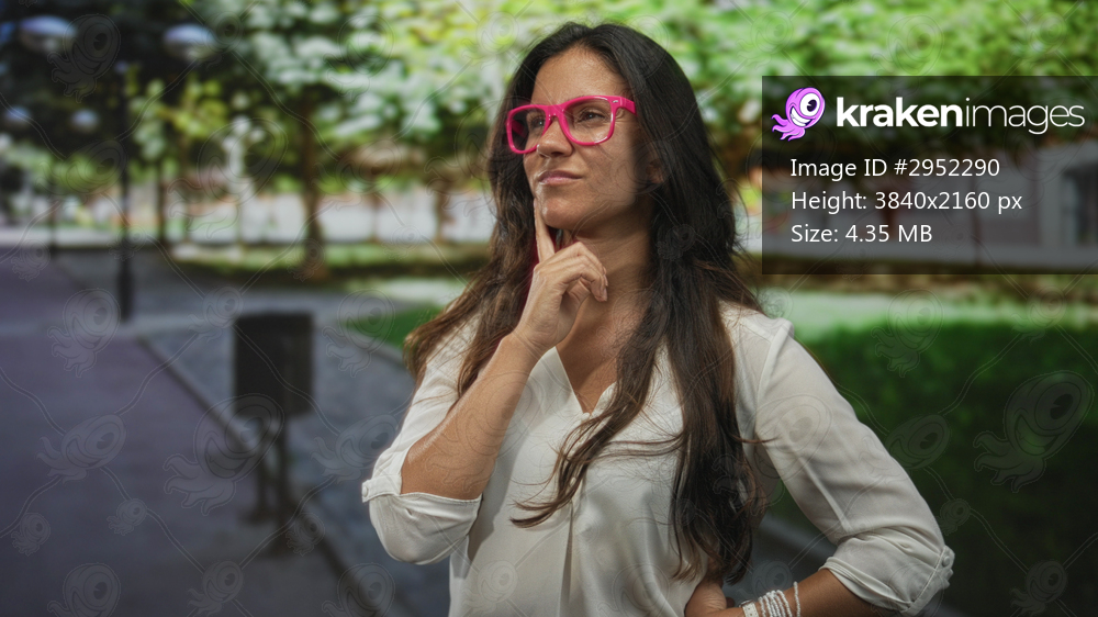 Woman with hand on chin on street near trees and lampposts wearing pink glasses and white blouse, considering her options; thoughtful reflection.