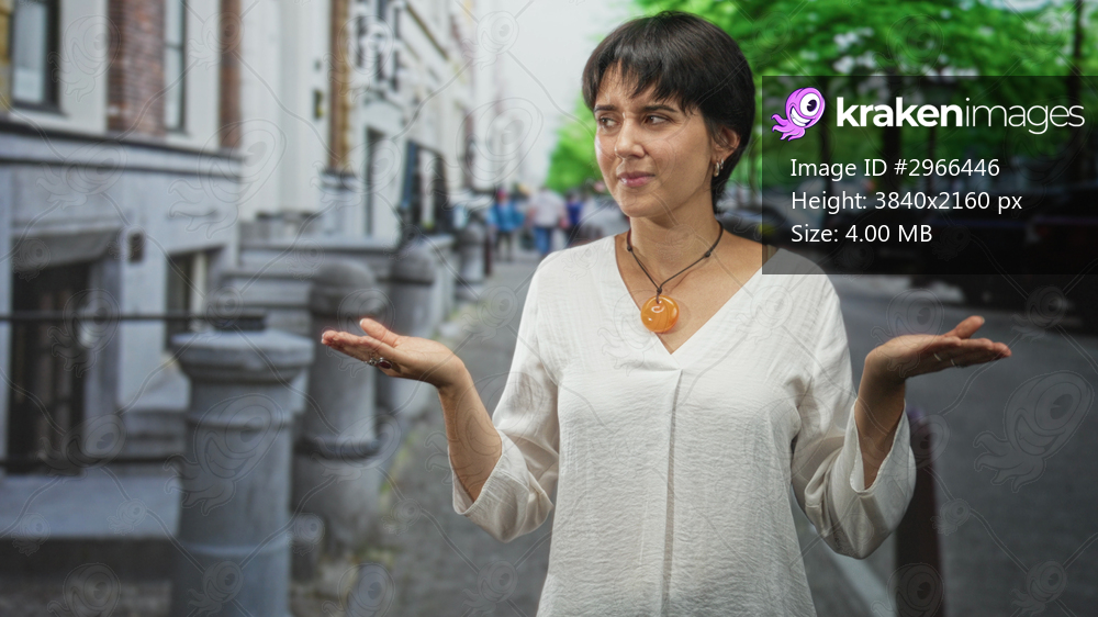 Woman with hand on chin and orange pendant necklace standing on a city street, gaze to side and arms folded; thoughtful reflection.
