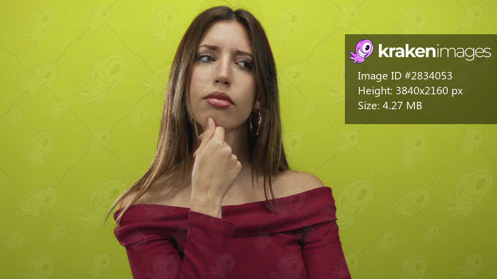 Woman with hand on chin and pensive expression gazes sideways against lime green studio wall for thinking; contemplation.