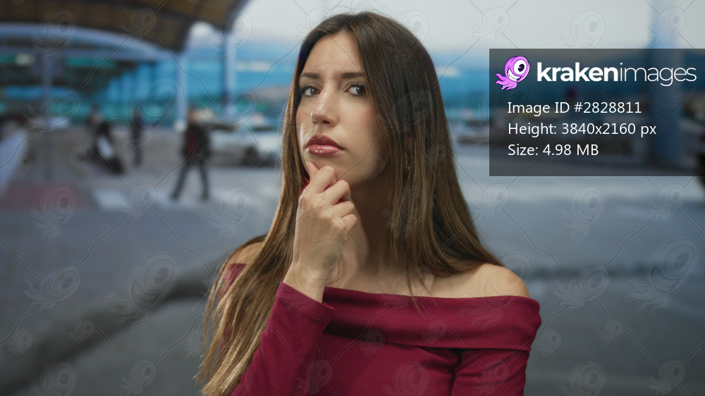 Woman with hand on chin and pensive expression standing at airport terminal outdoors; quiet reflection.