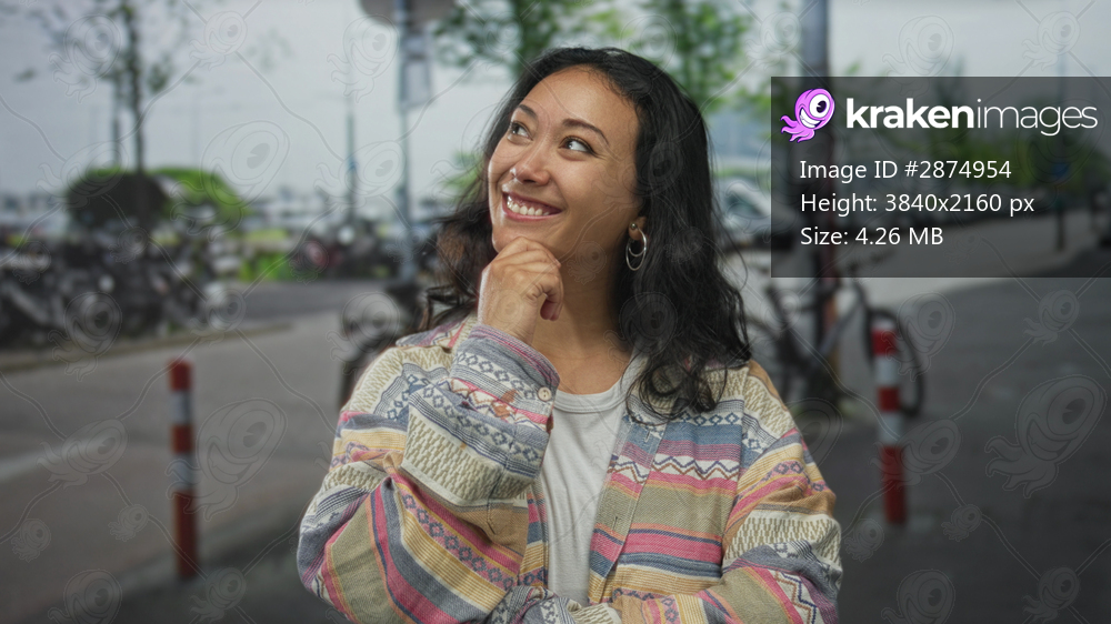Woman hand on chin pensive pose on a city street near parked bicycles and red bollards wearing a patterned jacket and hoop earring; thoughtful.
