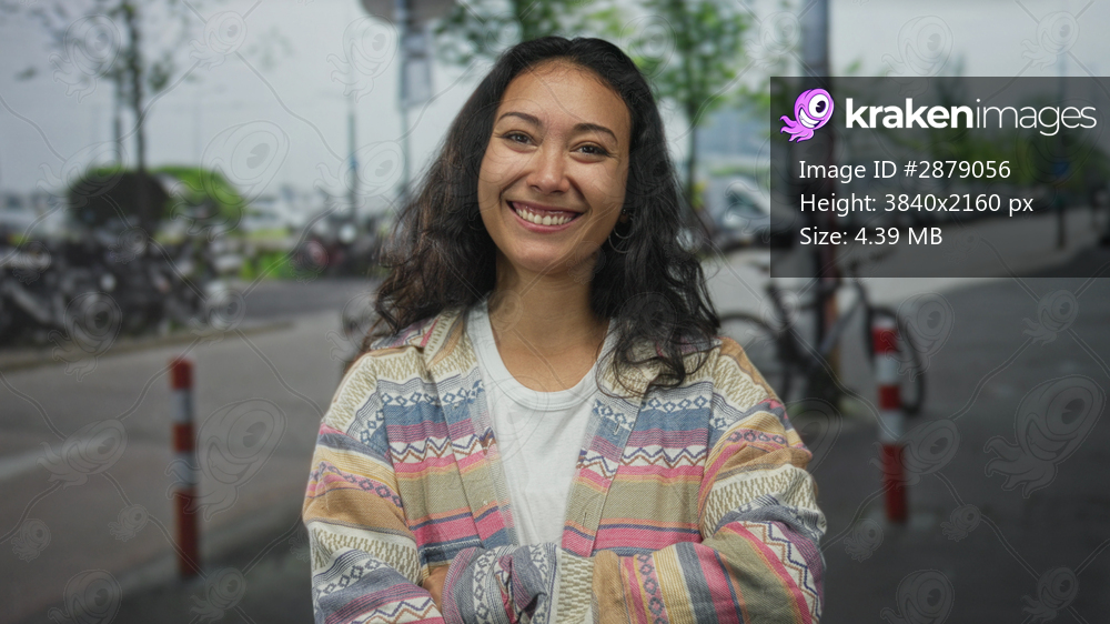 Woman hand on chin pensive pose on a city street near parked bicycles and red bollards wearing a patterned jacket and hoop earring; thoughtful.
