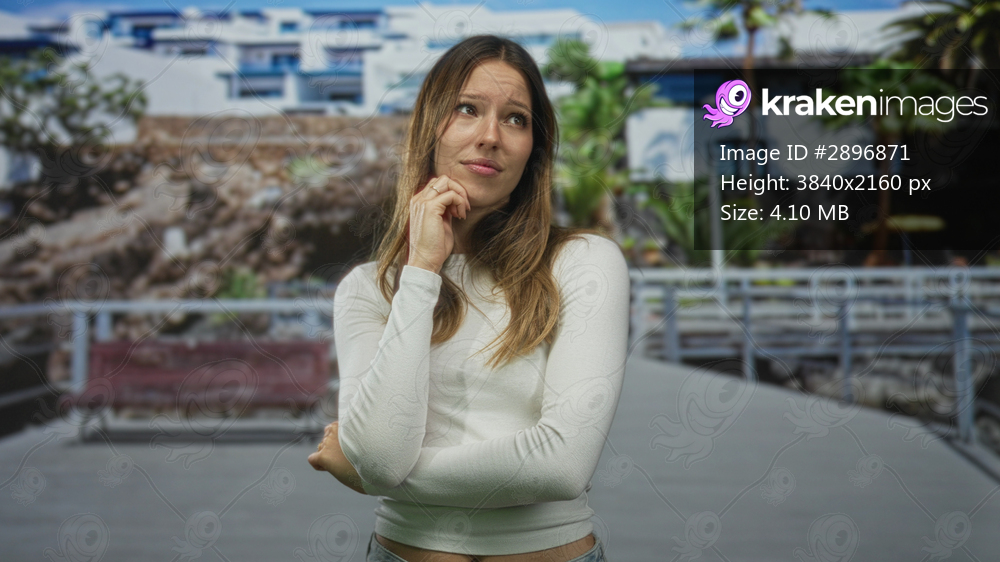 Woman hand on chin pensive pose on street near a bench and building, looking upward with folded arms; contemplation pondering curiosity.