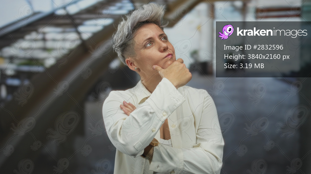 Woman with hand on chin pensive pose wearing wristwatch in building lobby next to staircase; inner reflection.