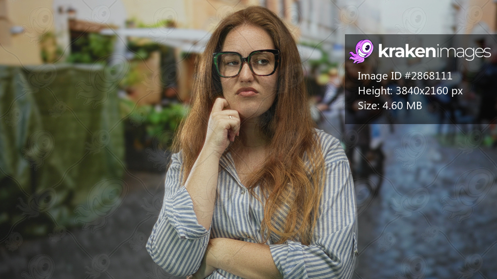 Woman with hand on chin and red hair in blue striped shirt and glasses on busy city street; quiet contemplation.