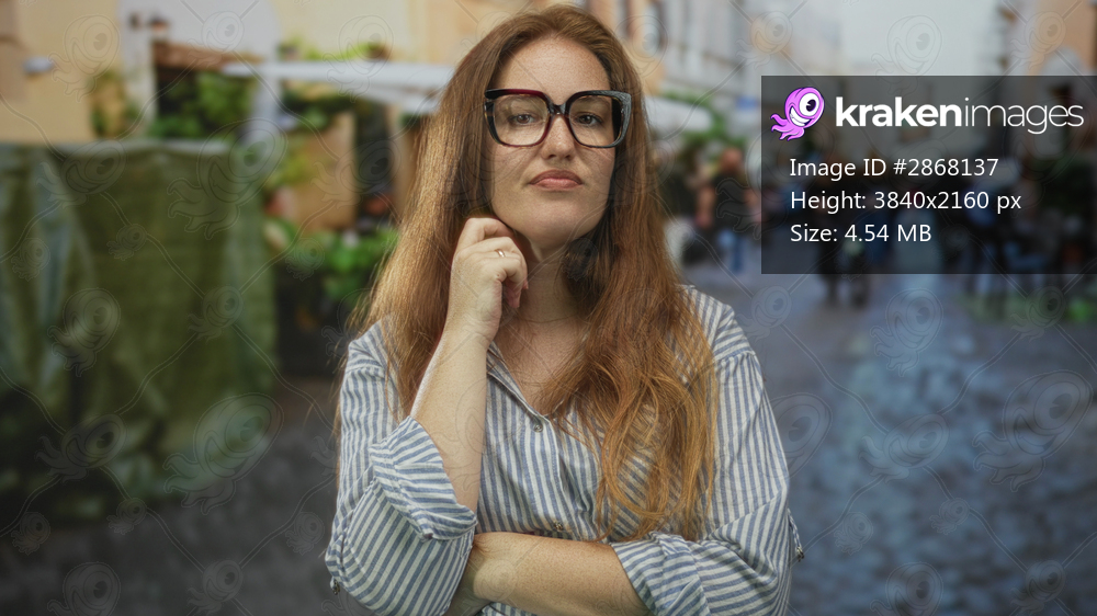 Woman with hand on chin and red hair in blue striped shirt and glasses on busy city street; quiet contemplation.