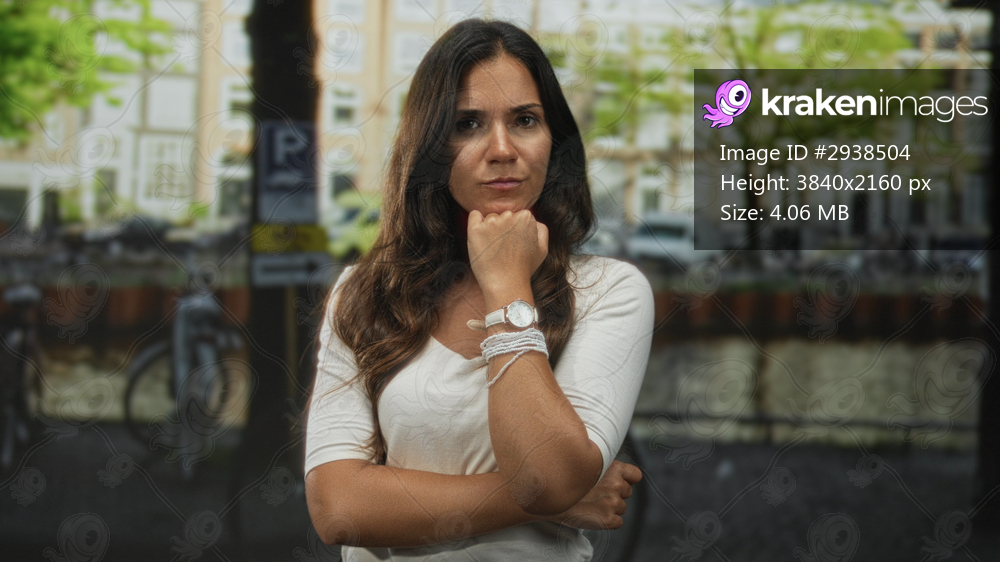 Woman with hand on chin resting on street by an amsterdam canal wearing white shirt and watch, arms folded and direct gaze; pensive reflection.