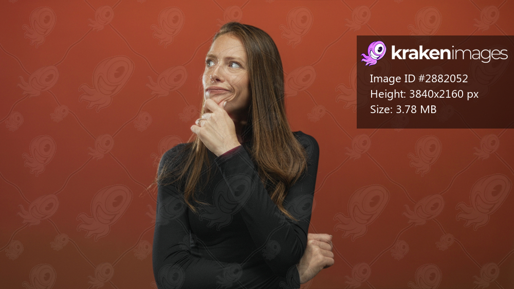 Woman with hand on chin and slight smile touching face while thinking in studio with orange backdrop; curiosity pondering reflection.