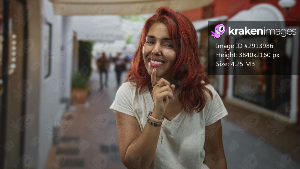 Woman with hand on chin smiling in a pedestrian street with shops and awnings, wearing white tee and bracelets; playful thinking.