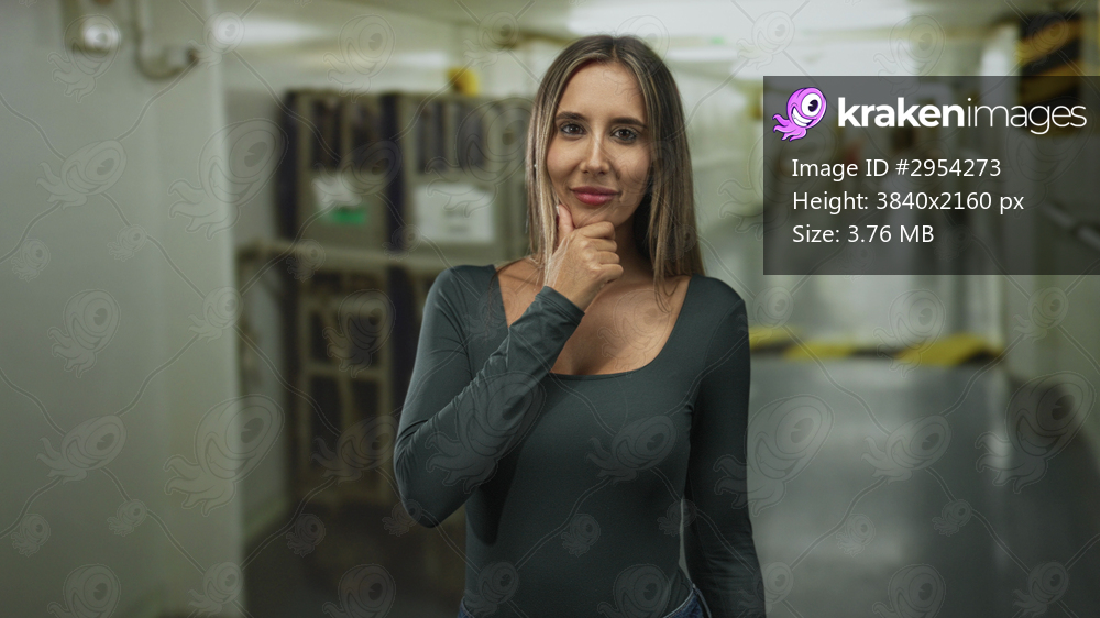 Woman with hand on chin standing in building corridor near yellow caution stripes and storage cart, slight smile; thoughtful introspection focus.