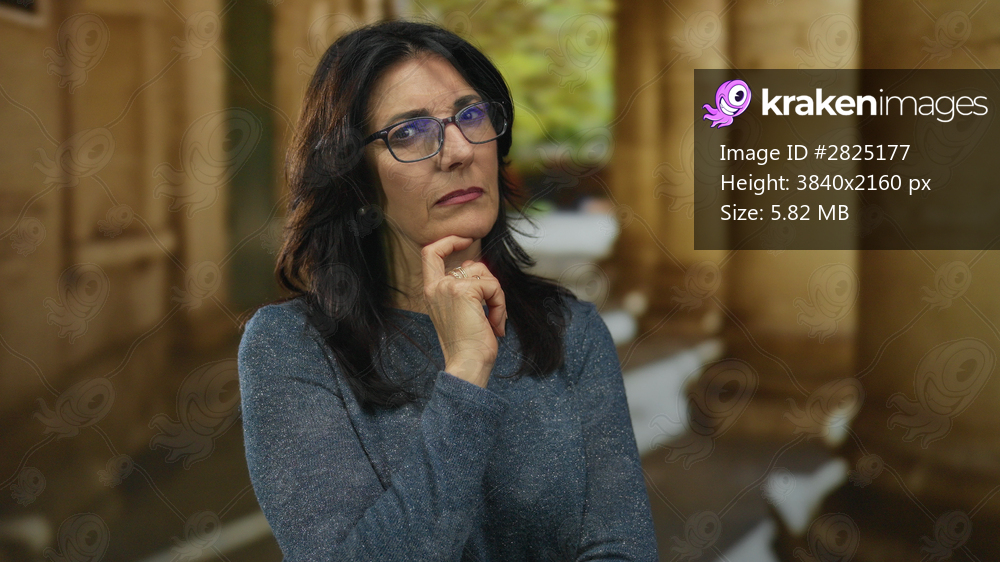 Woman with hand on chin stands on street in historic old town lined with sandstone columns and stone benches; quiet reflection.
