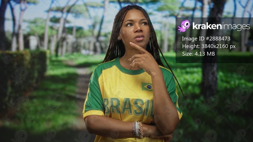 Woman with hand on chin thinking in forest setting wearing yellow green brasil jersey and bracelets; contemplation doubt reflection.