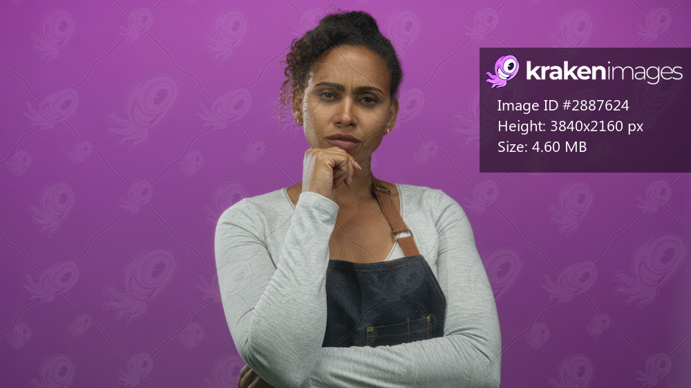 Woman with hand on chin thinking pose in purple studio wearing denim apron and long sleeve top; thoughtful doubt.