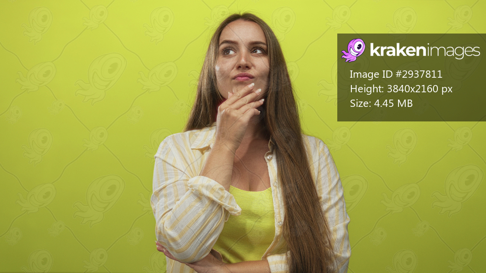 Woman with hand on chin thinking pose in studio with yellow backdrop, long hair and yellow top; thoughtful reflection.