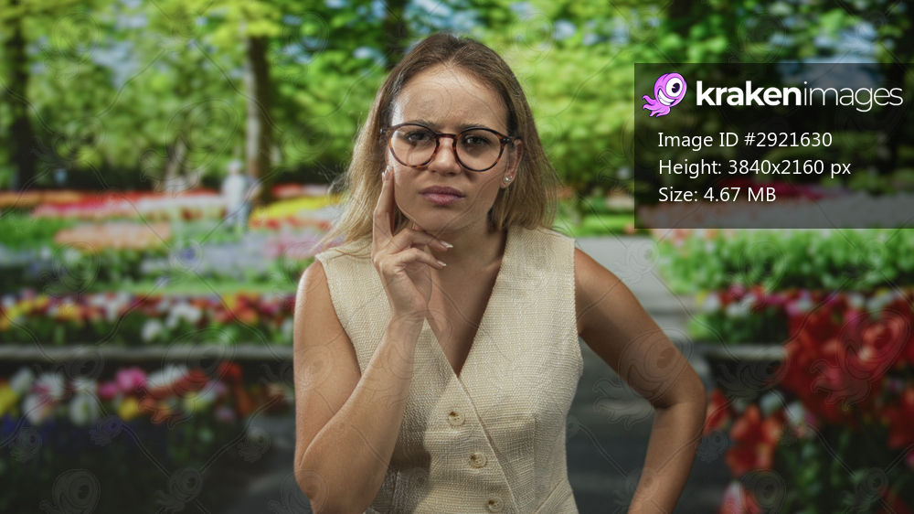 Woman with hand on chin touching face in park flowerbeds wearing glasses and sleeveless vest; pensive contemplation.
