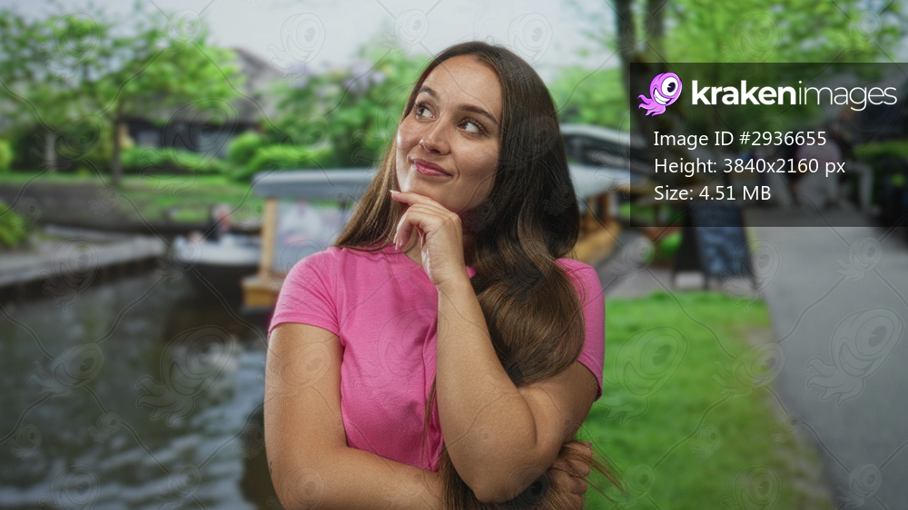 Woman with hand on chin touching hair on street by canal in amsterdam wearing pink tshirt; confidence contemplation.