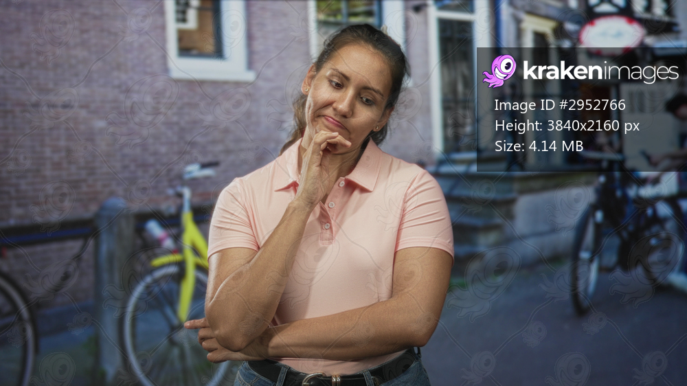Woman with hand on chin wearing a pink polo by a bicycle on a city street near a brick building; thoughtful doubt.
