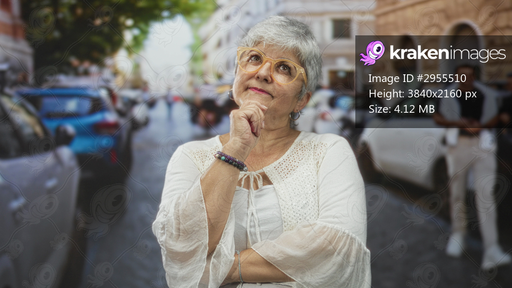 Woman with hand on chin wearing glasses and white cardigan smiling in a cobblestone street with parked cars; contentment.