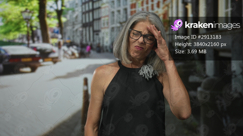Woman with hand on forehead on street in city wearing glasses and black sleeveless dress; concern uncertainty.