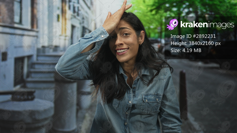 Woman with hand on forehead on street in denim shirt with open mouth gesture near building steps and parked car; surprise spontaneity.