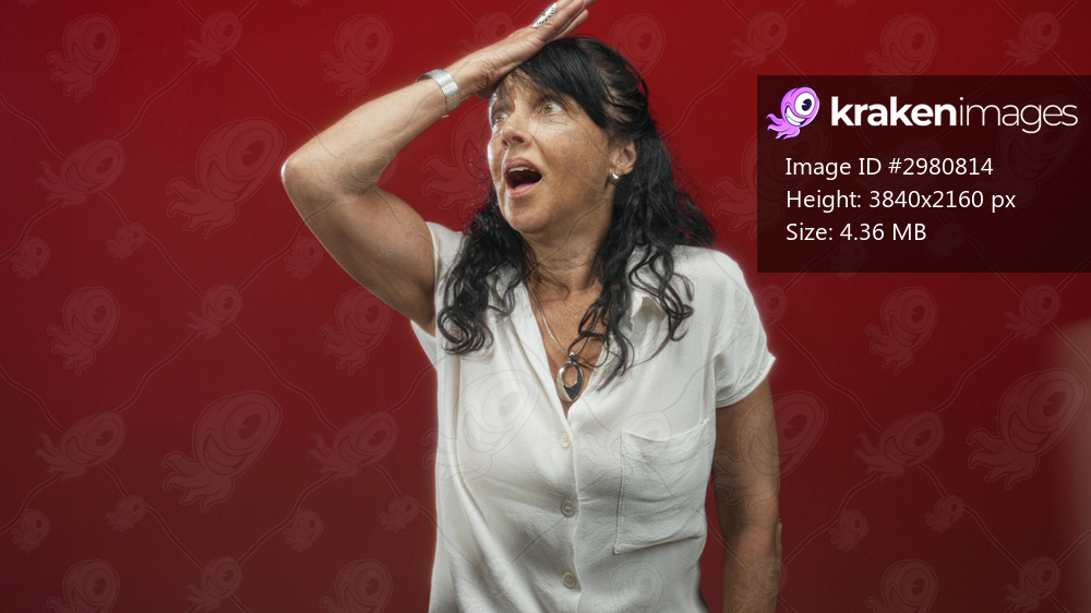 Woman with hand on forehead, open mouth and surprised expression, wearing a white shirt and pendant against a red studio backdrop and soft lighting; surprise. - Kraken Images