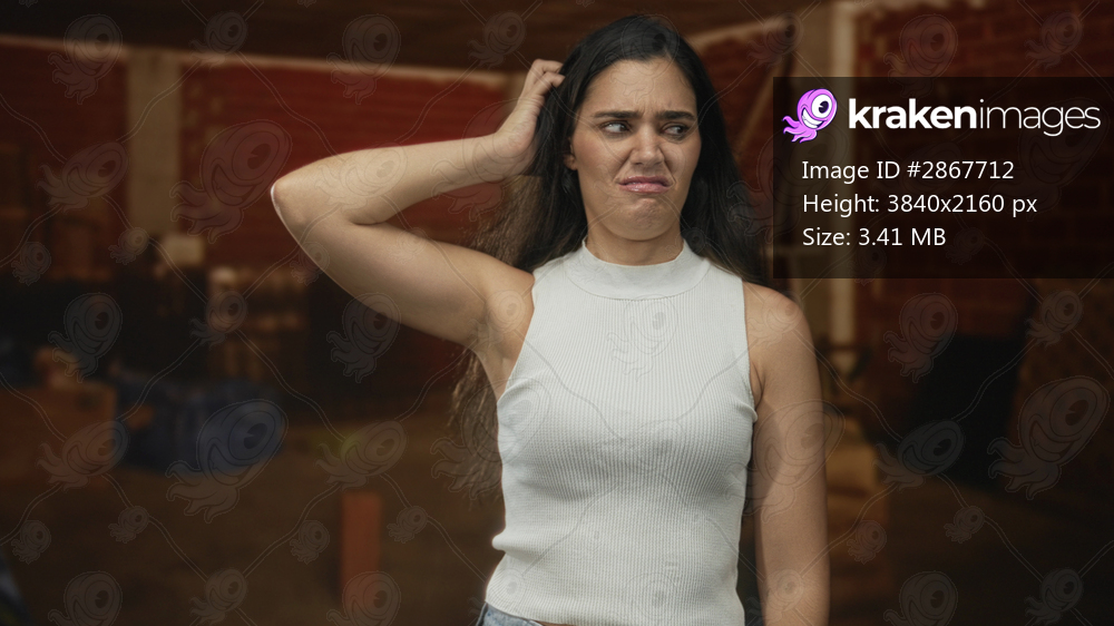 Woman with hand on head and disgusted face in building construction site looking at time and rubbing temple; late night annoyance.