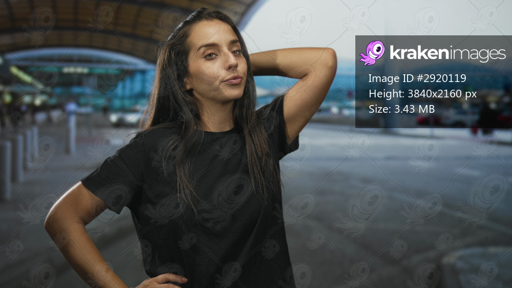 Woman with hand on head and fingers in hair at airport terminal curbside pickup, wearing black t shirt, looking upward with pursed lips; impatience.