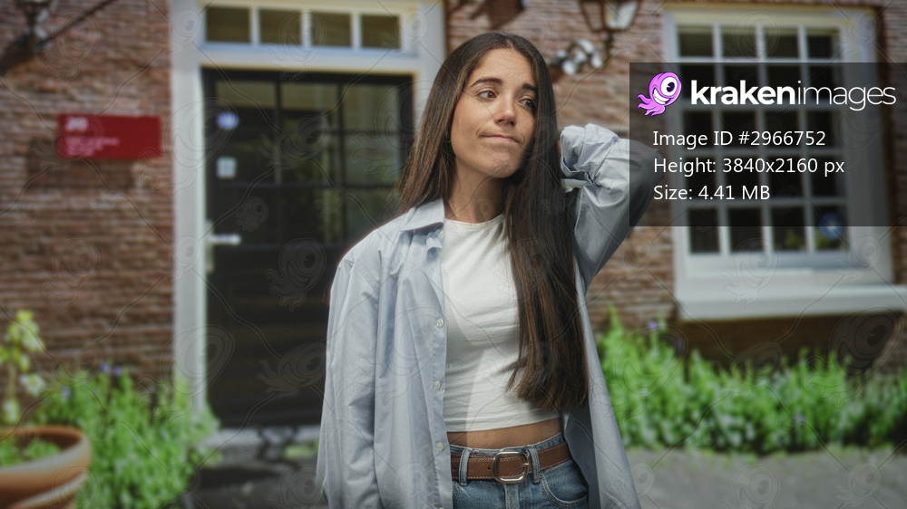 Woman with hand on head touching hair by a building doorway and window, wearing casual shirt and jeans; thoughtful reflection.
