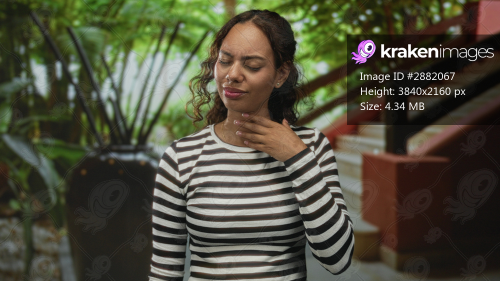 Woman hand on neck at outdoor building staircase, wearing striped top and squinting with discomfort; discomfort awareness.