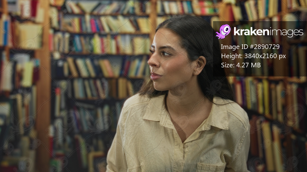 Woman with hand on neck glancing sideways among packed bookshelves in a building library; quiet contemplation.