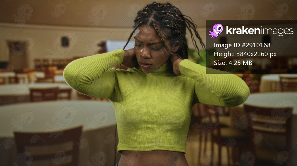 Woman hand on neck in building wearing green cropped turtleneck and braids looking sideways; quiet subtle unease.